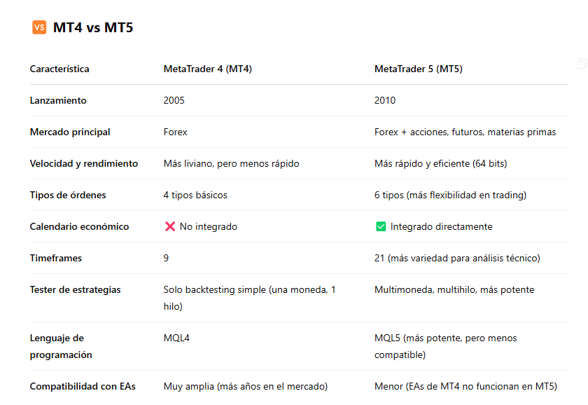Aunque ambos cumplen funciones similares, existen diferencias importantes entre MetaTrader 4 (MT4) y MetaTrader 5 (MT5) que debes conocer: