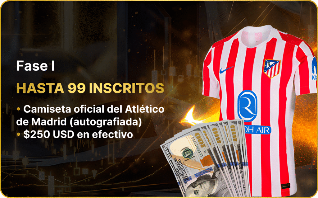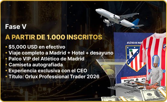 - El premio final dependerá del número de inscritos, pudiendo incluir: $5,000 USD en efectivo, viaje VIP (vuelo + hotel + palco del Atlético de Madrid), camiseta autografiada, experiencia exclusiva con el CEO y el título oficial “Orlux Professional Trader 2026”.